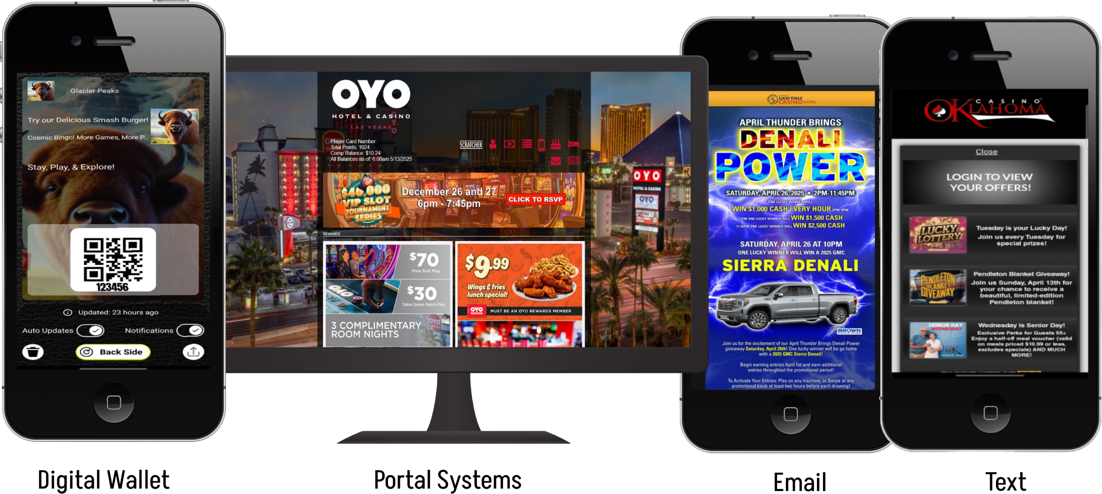 The Digital Marketing Wallet is a mobile app and digital player’s card that users can load onto their devices. It sends notifications to lock screens and the front of the card, with a flip feature to access a personalized rewards portal. Players can view all account details, RSVP for events, retrieve win/loss statements, book rooms, and more.